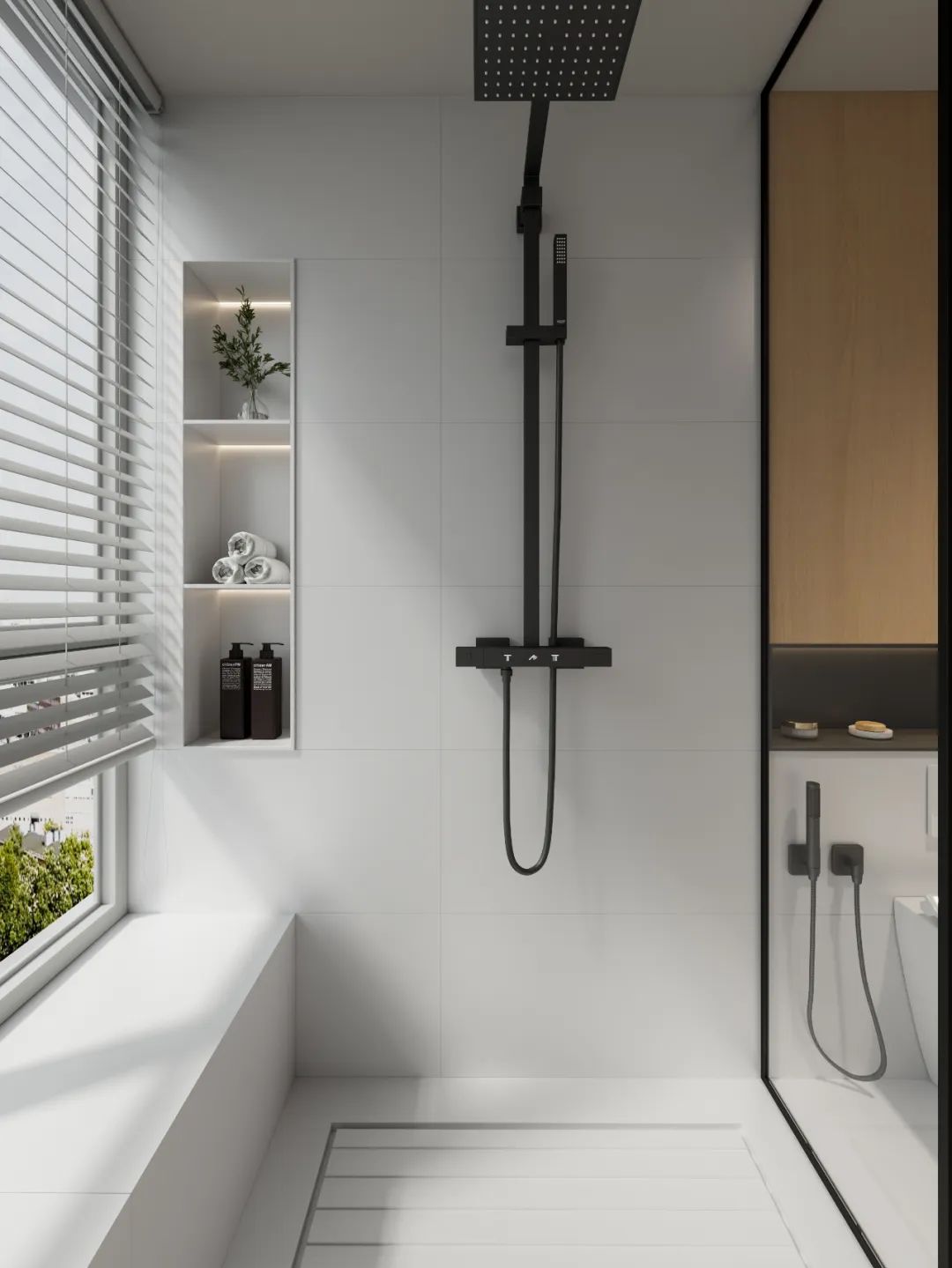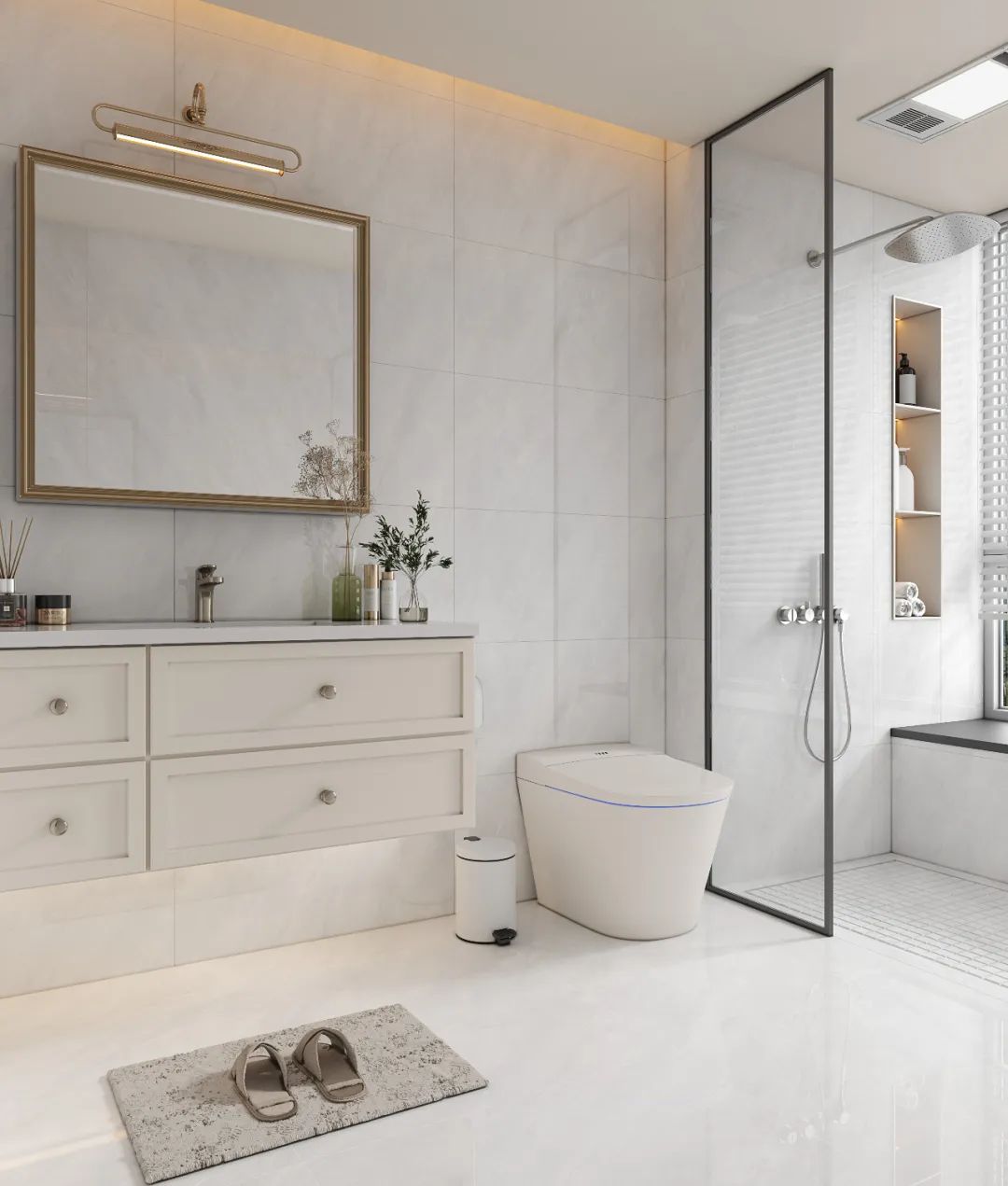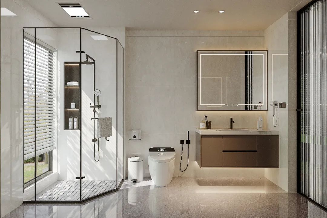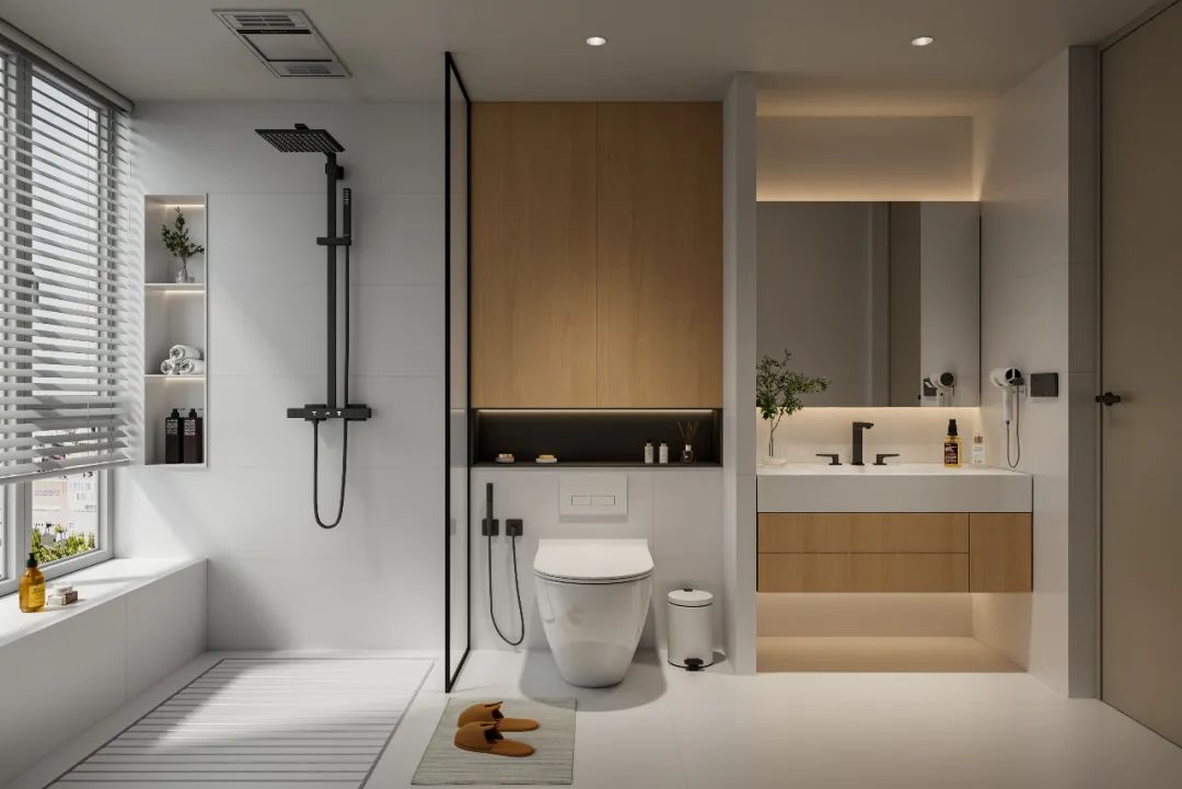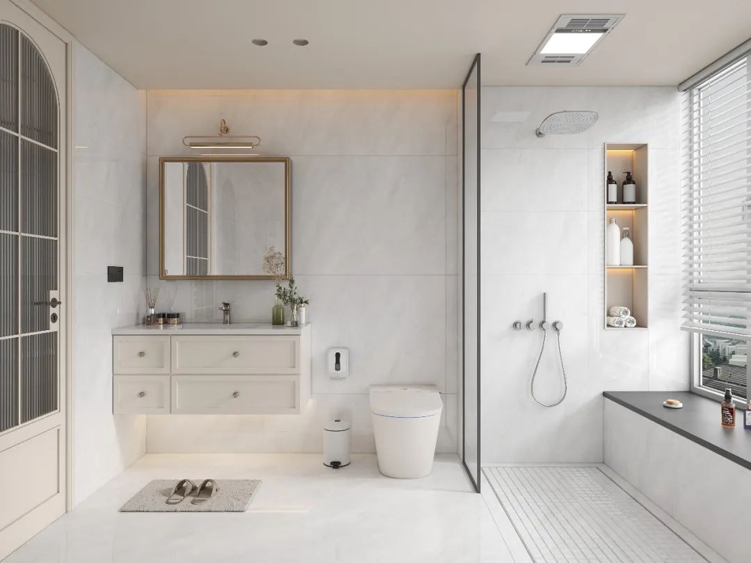 甜暖松弛的柔光奶油白,比純白暖一度,低飽和的色彩作為主色調,搭配原木木質肌理浴室柜和柔和的燈光,營造出溫柔治愈的空間。