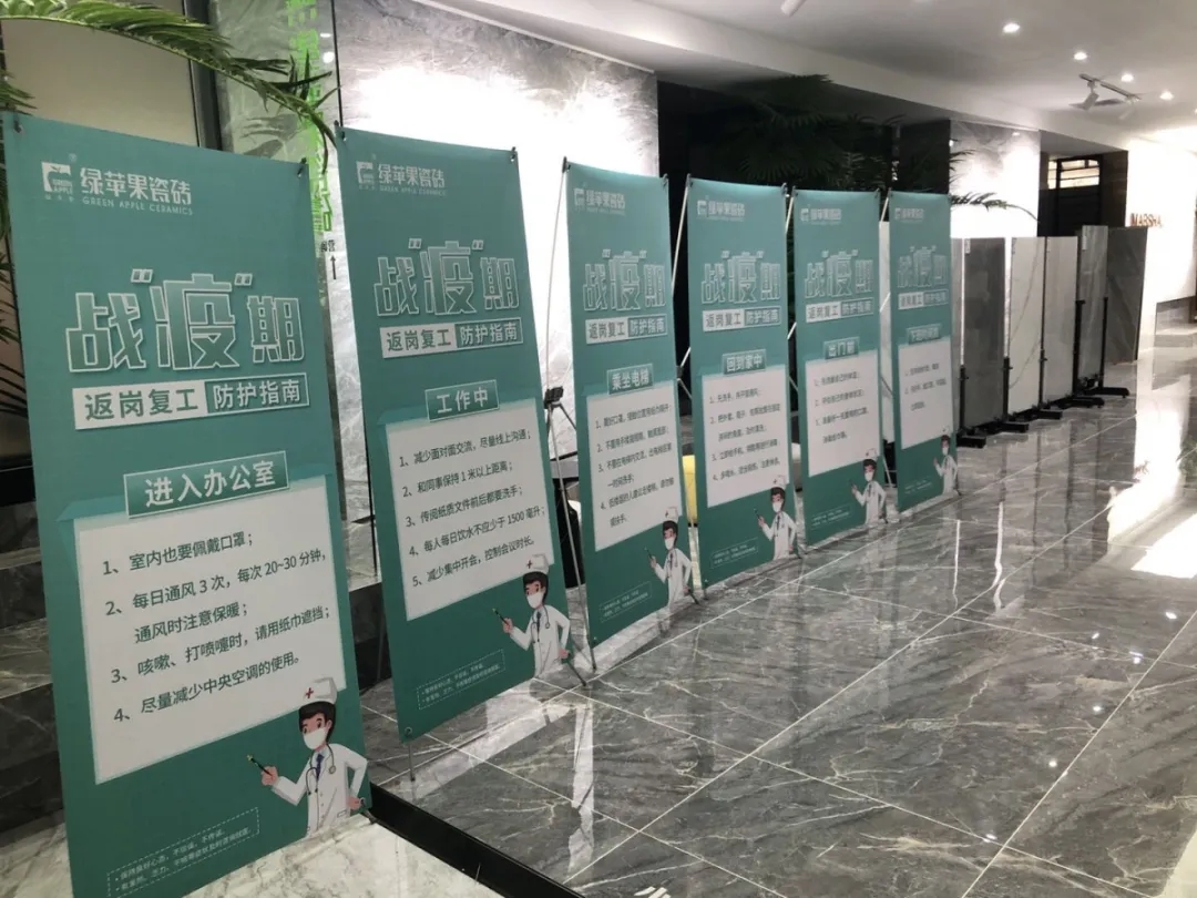 疫情非常時期,安全的工作環境是企業復工的必要條件。為此,綠蘋果瓷磚積極響應政府部門疫情防控要求,堅決落實各項防護措施:錯峰返崗、噴灑消毒、檢測體溫、人員登記、普及防護知識等,全方位保障復工環境的安全衛生和綠蘋果家人的健康。